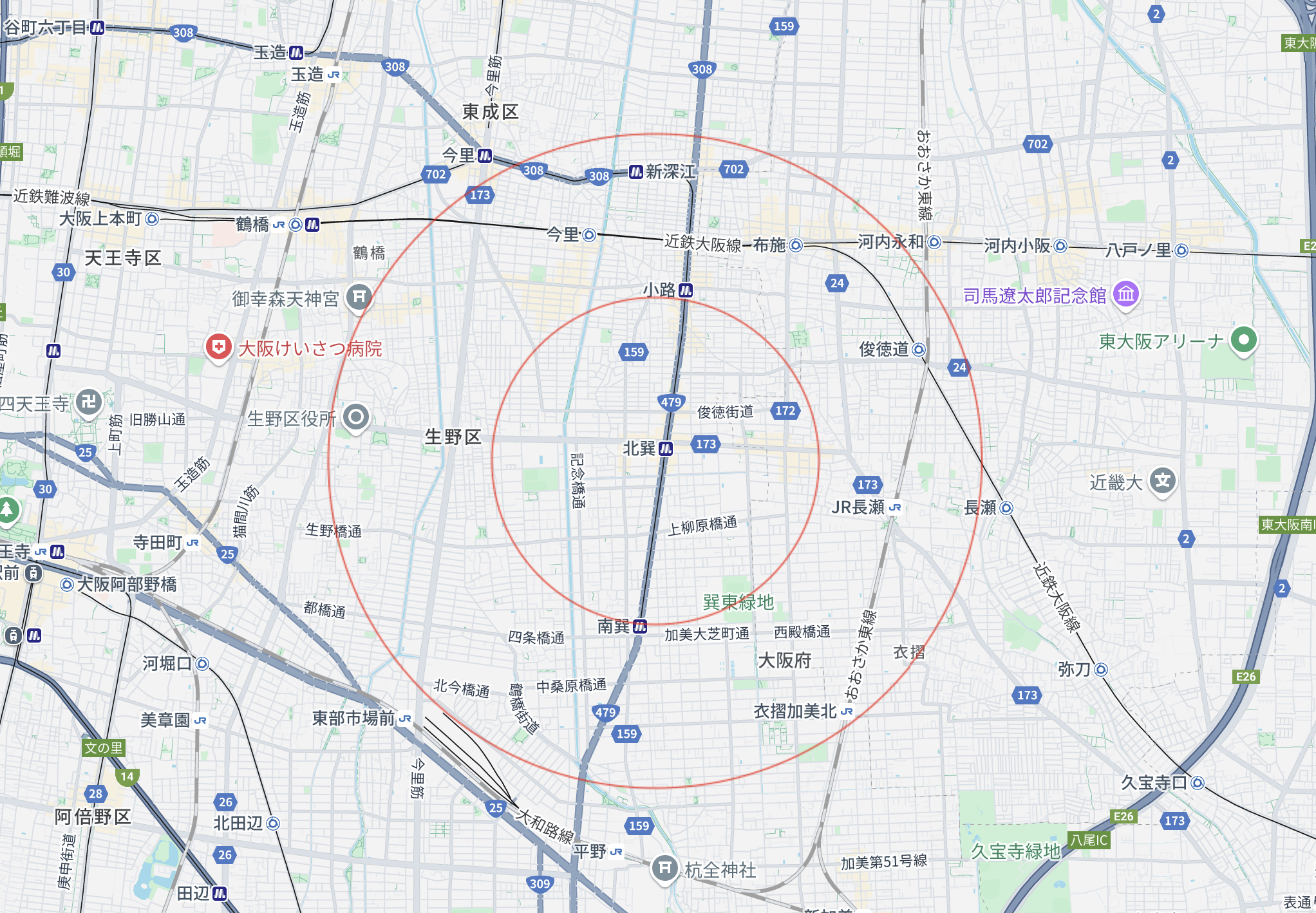 地図のとおり、大阪市内でありながら北巽駅エリアはシンプルな商圏となっており、